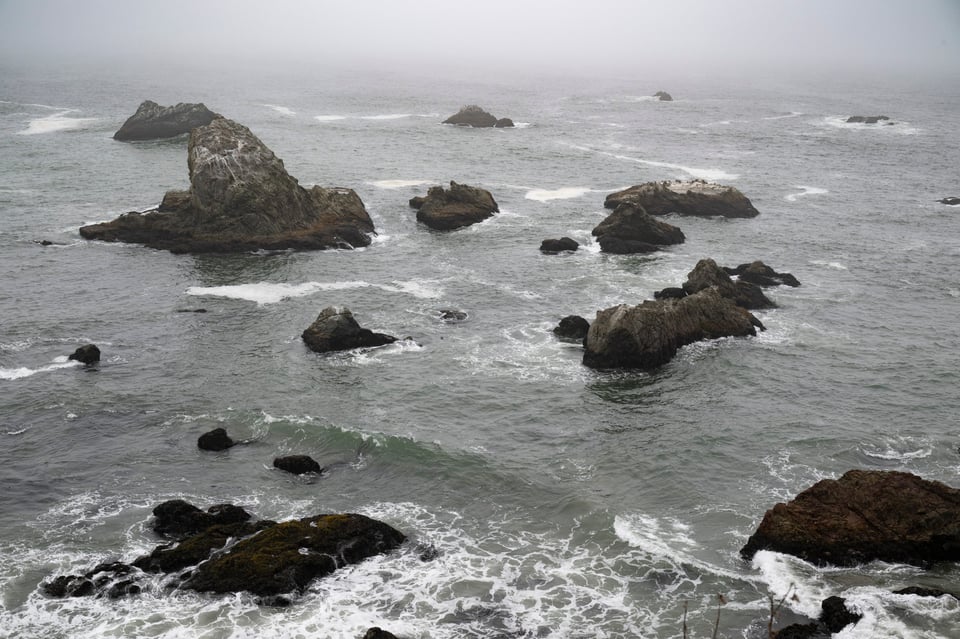 Remember yesterday, when I got to Fort Bragg, and there was a ton of fog? It was sunny when I left, but the fog quickly closed in. Sometimes it would open up, but for much of the time all I could see was the hundred feet in front of me. Sometimes I would see hints of what would probably be a breath-taking view on a clear day, and a few times the fog did clear enough for me to stop and take some pictures. Not much, and not for long, though.